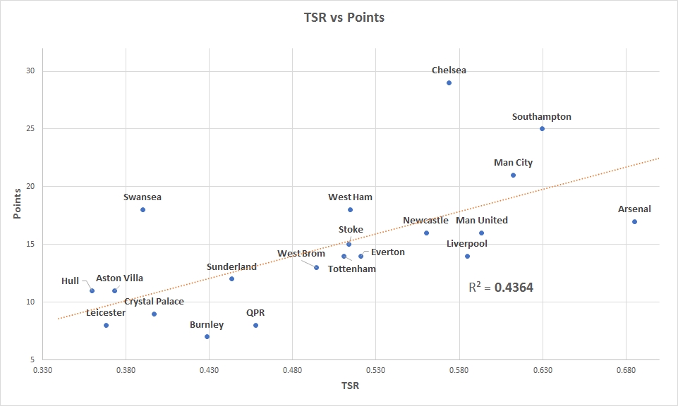 Another surprise team this season, Southampton, are also way above the line. However, they still have the second best TSR overall, so their league position looks more sustainable.