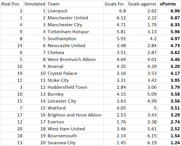 I ran simulations of the shots taken in each game using a simple shots model. Here is the table based on those simulations. As shots are far more numerous than goals, it should give a better idea of how teams are doing at this early stage – although three games is still far too soon to make any bold predictions.