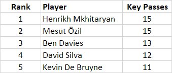 Looking at statistics from the first four rounds of Premier League action I came across this rather interesting table of the five players with the most “key passes” this season. A “key pass” is one that leads to a shot, so it gives an idea of how many chances a player has created.